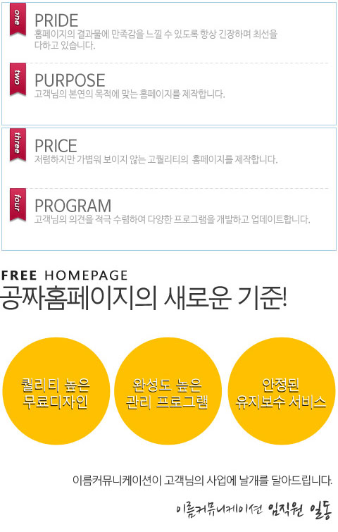 무료이지만 퀄리티가 높은 디자인과 다양한 기능을 보유한 홈페이지를 공급하기 위해 노력하고 있습니다. 다양한 사업모델을 연구하고 필요한 시스템을 개발하며 고객의 니즈에 부합되는 완성도 높은 홈페이지를 제공해 드리고 있습니다.